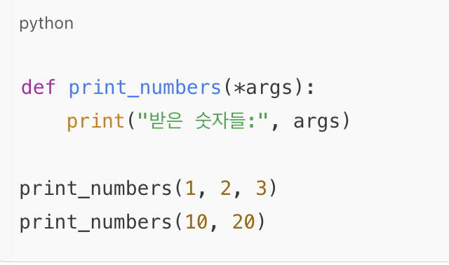 - 함수의 정의에서 *args로 설정하고, 호출할 때 인자를 여러 개 넘길 수 있어.