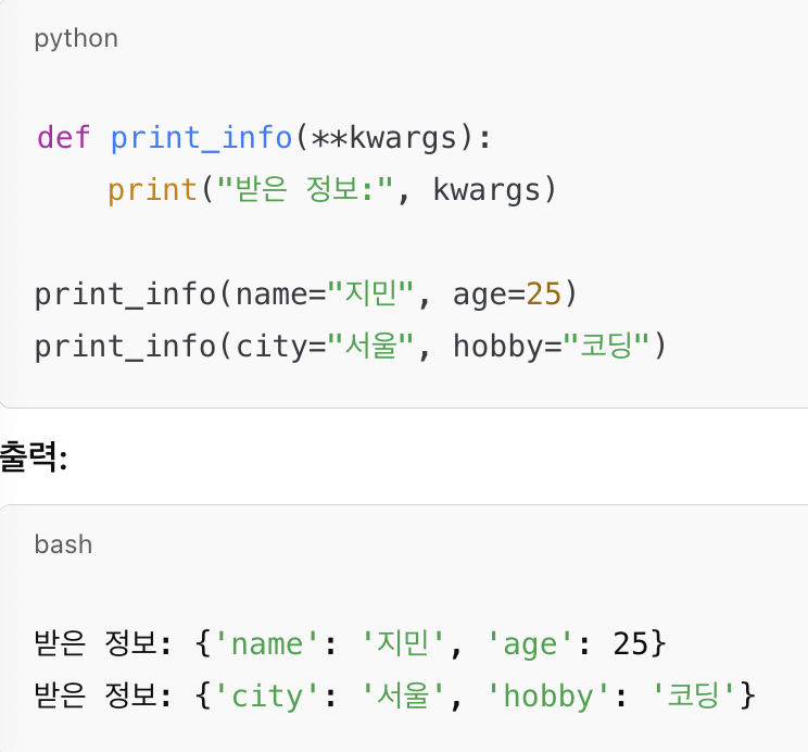 - 여러 개의 이름이 있는 인자를 받을 수 있다. (key=value 형태)